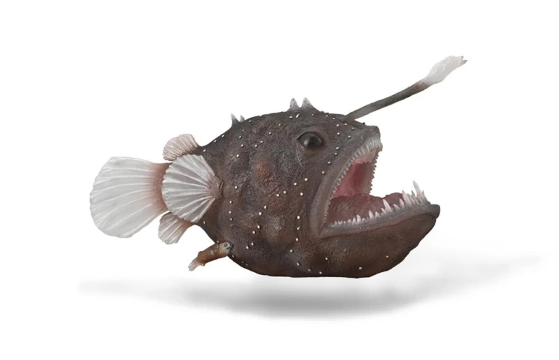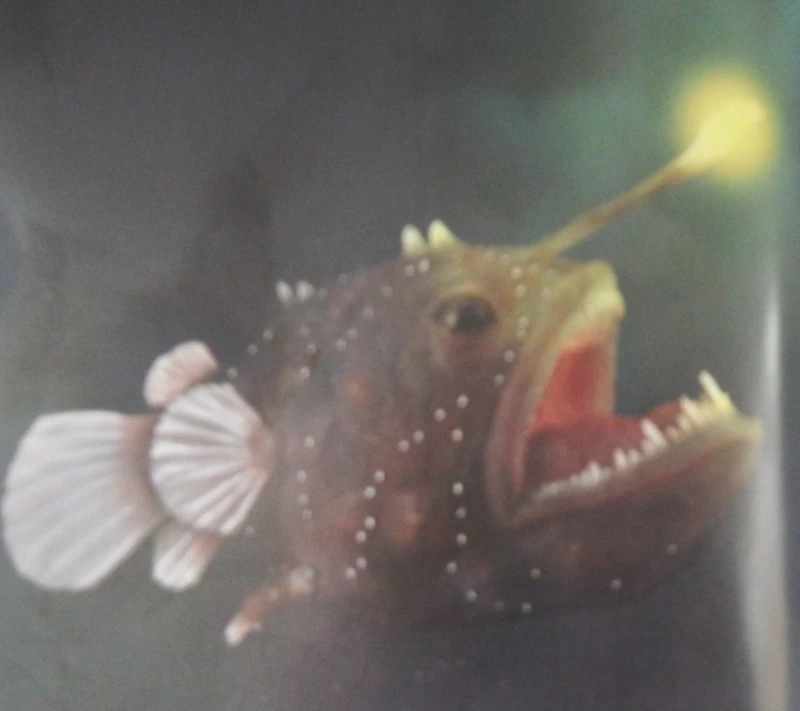 Het vrouwtje heeft een aangepaste rugvin boven haar bek uitsteken, welke als oplichtend lokaas dient voor de prooi.